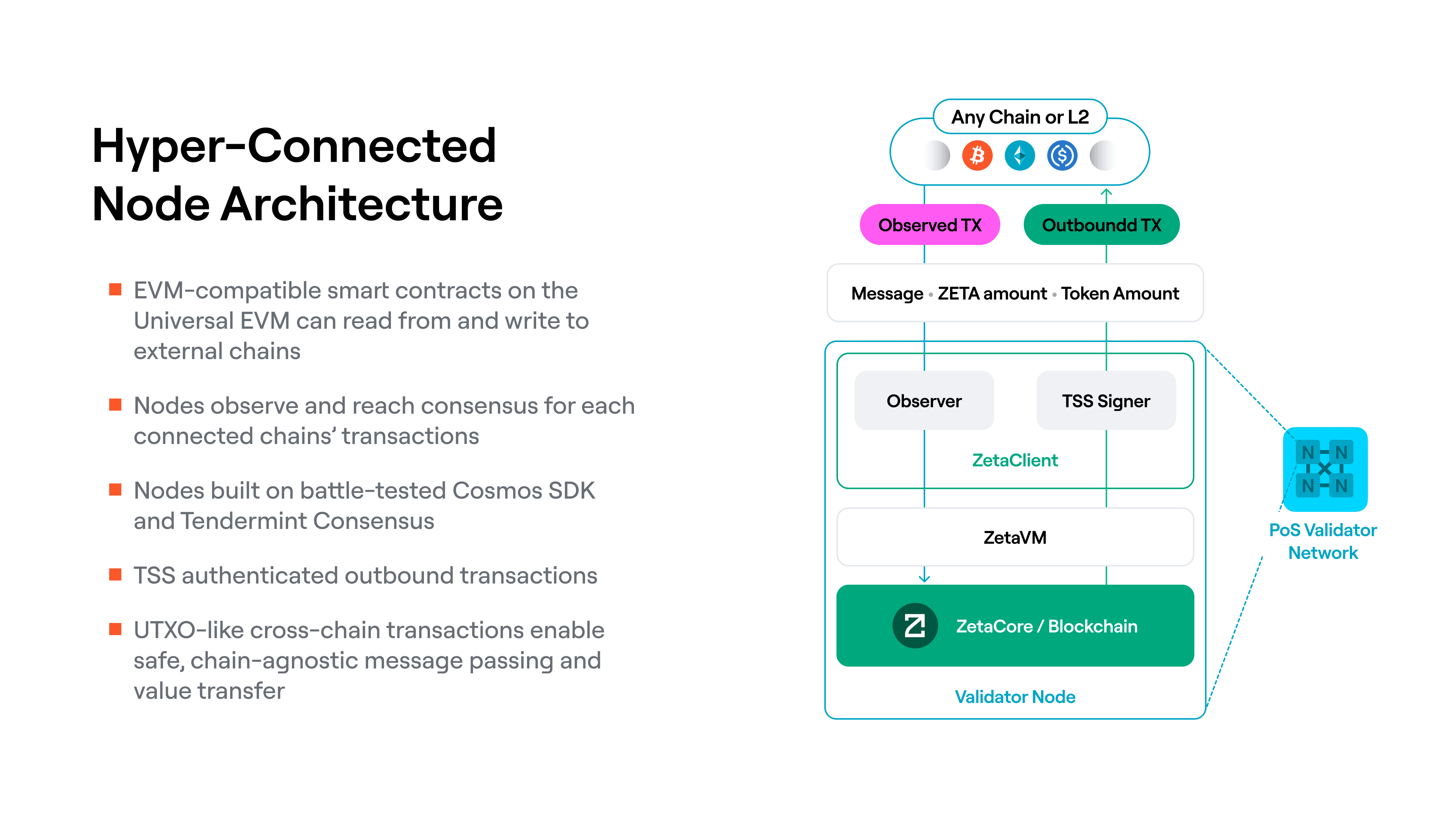 The ZetaChain architecture consists of a distributed network of nodes, often referred to as validators. Validators act as decentralized observers that reach consensus on relevant connected chain state and events, and can also update connected chain state via distributed key signing. ZetaChain accomplishes these functions in a decentralized (without a single point of failure, trustless, permissionless), transparent, and efficient way.
